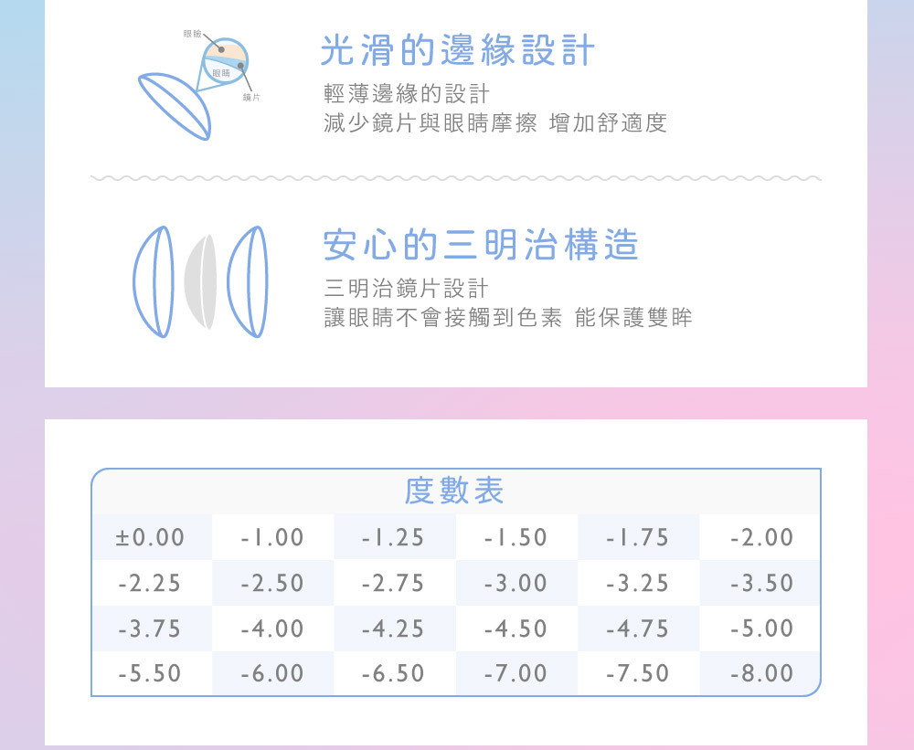 ・配戴一般隱形眼鏡須經眼科醫師或合格驗光人員驗光配鏡,並定期接受眼科醫師追蹤檢查。本器材不得逾中文仿單建議之最長配戴時數、不得重覆配戴,於就寢前務必取下,以免感染或潰瘍。如有不適,應立即就醫。消費者使用前應詳閱醫療器材說明書。消費者聯絡信箱:service@chooselens.com
