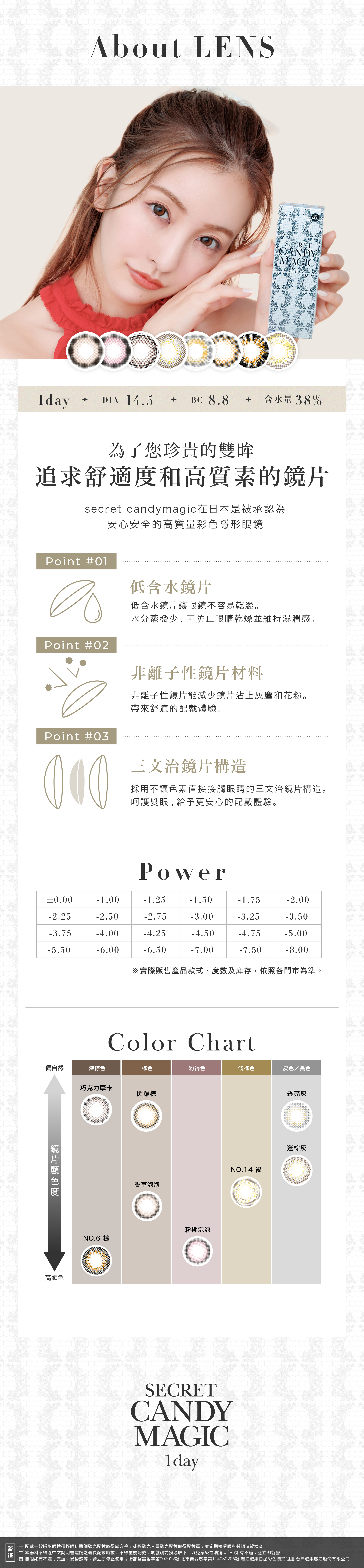 ・配戴一般隱形眼鏡須經眼科醫師或合格驗光人員驗光配鏡,並定期接受眼科醫師追蹤檢查。本器材不得逾中文仿單建議之最長配戴時數、不得重覆配戴,於就寢前務必取下,以免感染或潰瘍。如有不適,應立即就醫。消費者使用前應詳閱醫療器材說明書。消費者聯絡信箱:service@chooselens.com
