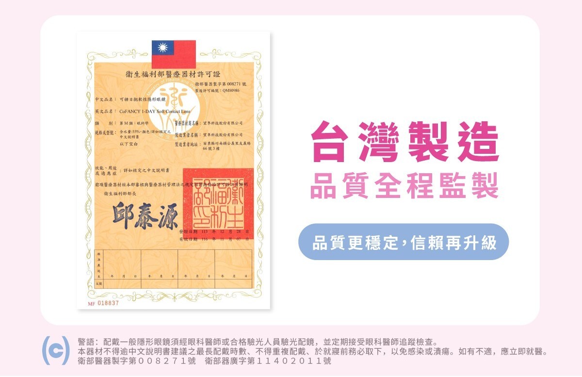 ・配戴一般隱形眼鏡須經眼科醫師或合格驗光人員驗光配鏡,並定期接受眼科醫師追蹤檢查。本器材不得逾中文仿單建議之最長配戴時數、不得重覆配戴,於就寢前務必取下,以免感染或潰瘍。如有不適,應立即就醫。消費者使用前應詳閱醫療器材說明書。消費者聯絡信箱:service@chooselens.com