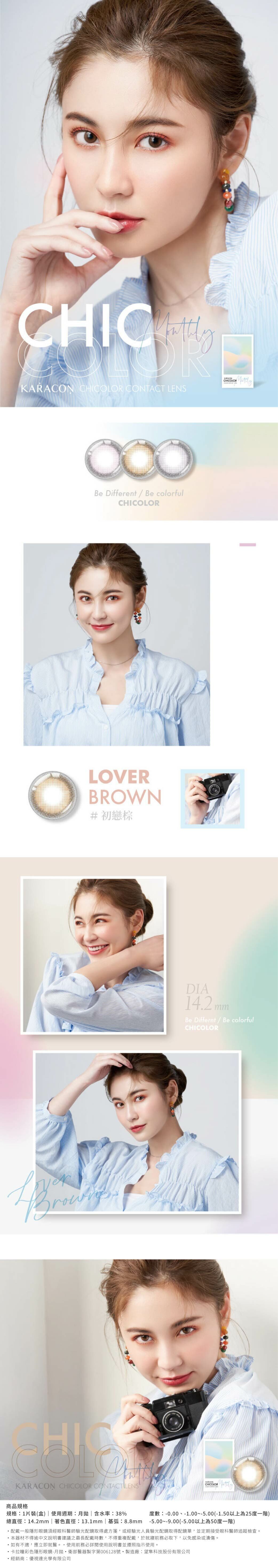 ・配戴一般隱形眼鏡須經眼科醫師或合格驗光人員驗光配鏡,並定期接受眼科醫師追蹤檢查。本器材不得逾中文仿單建議之最長配戴時數、不得重覆配戴,於就寢前務必取下,以免感染或潰瘍。如有不適,應立即就醫。消費者使用前應詳閱醫療器材說明書。消費者聯絡信箱:service@chooselens.com