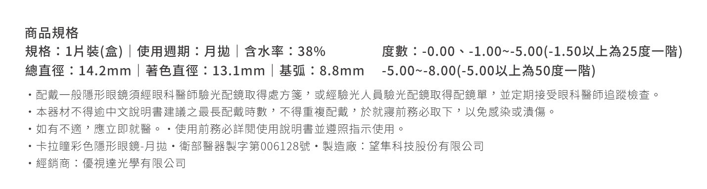 ・配戴一般隱形眼鏡須經眼科醫師或合格驗光人員驗光配鏡,並定期接受眼科醫師追蹤檢查。本器材不得逾中文仿單建議之最長配戴時數、不得重覆配戴,於就寢前務必取下,以免感染或潰瘍。如有不適,應立即就醫。消費者使用前應詳閱醫療器材說明書。消費者聯絡信箱:service@chooselens.com
