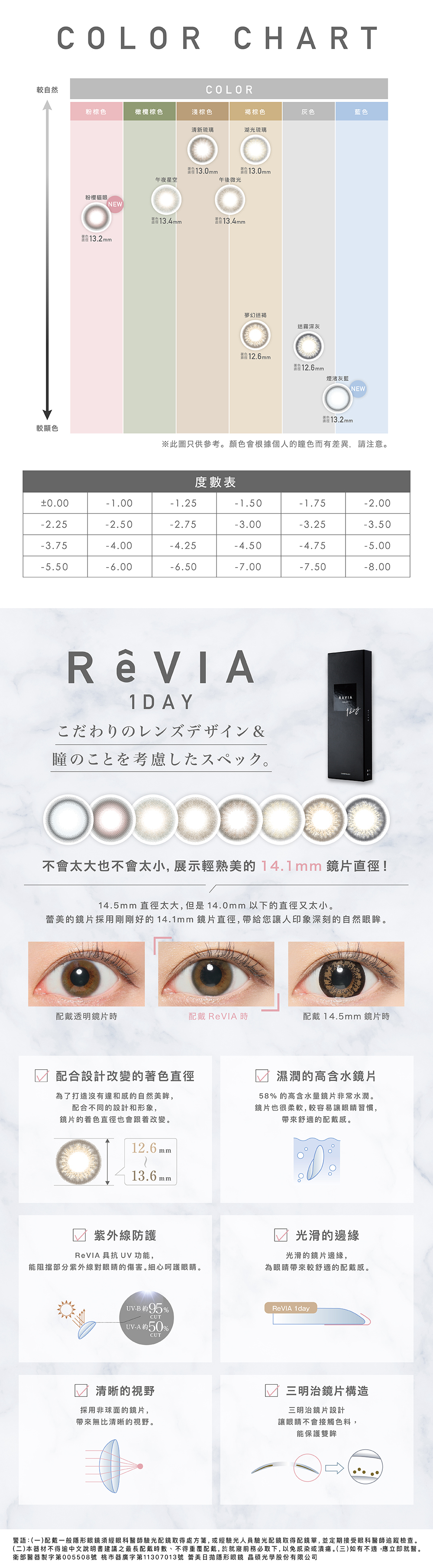 ・配戴一般隱形眼鏡須經眼科醫師或合格驗光人員驗光配鏡,並定期接受眼科醫師追蹤檢查。本器材不得逾中文仿單建議之最長配戴時數、不得重覆配戴,於就寢前務必取下,以免感染或潰瘍。如有不適,應立即就醫。消費者使用前應詳閱醫療器材說明書。消費者聯絡信箱:service@chooselens.com